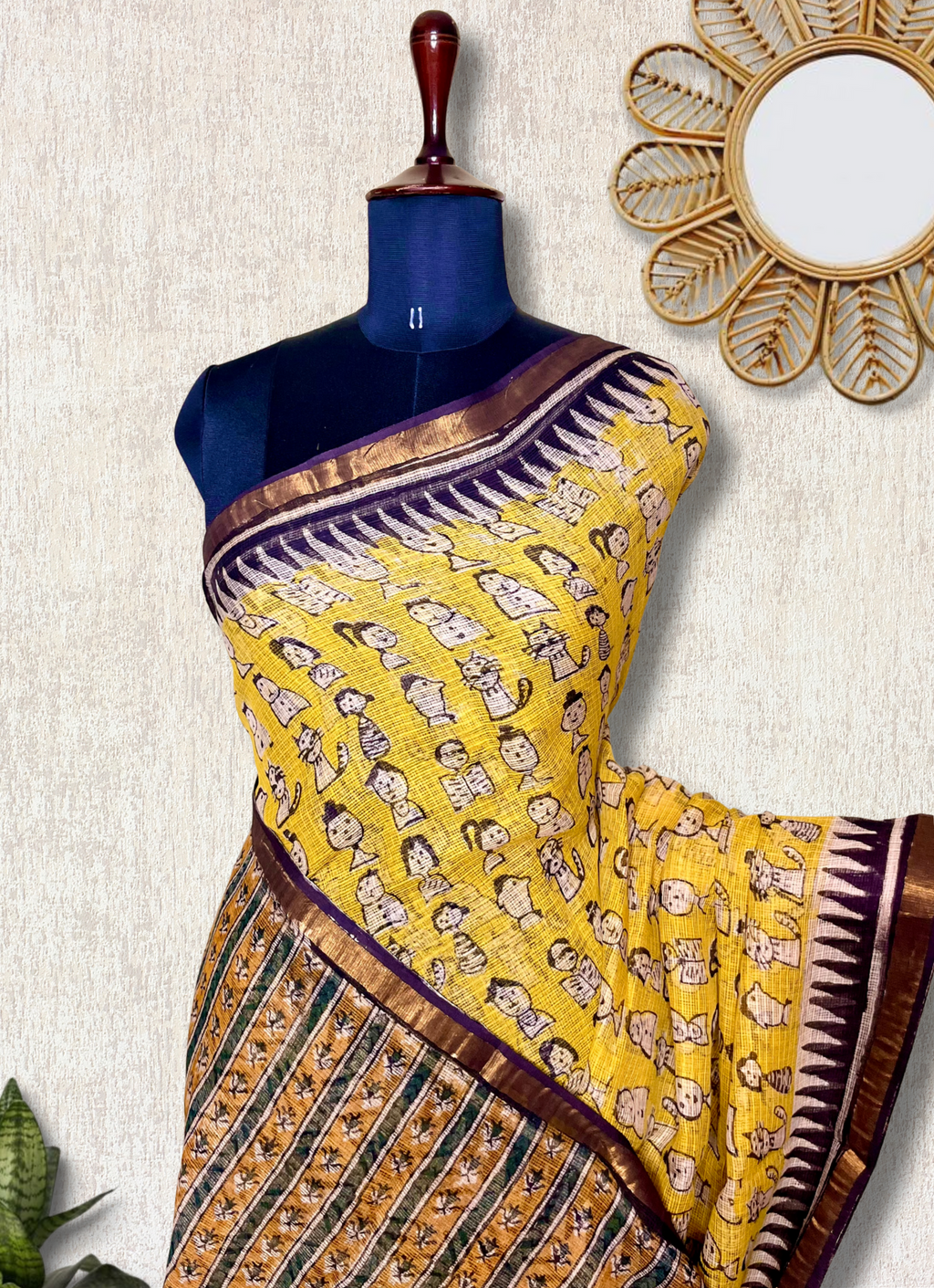 Handblock Printed Kota Doria Saree - Mustard Yellow + Pearl Black