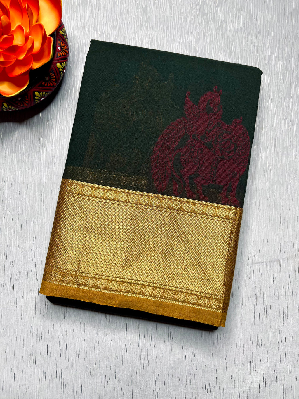 Kanchi Cotton Saree - Deep Green + Fuel Yellow