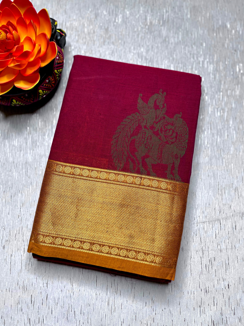 Kanchi Cotton Saree - Mulberry Red + Fiery Orange