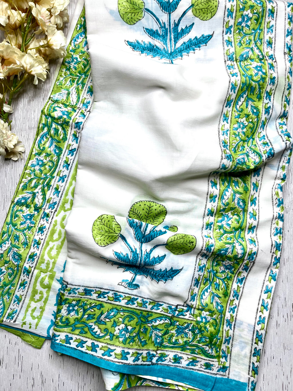 Handblock Printed Cotton Saree - Fountain Green + Swiss White