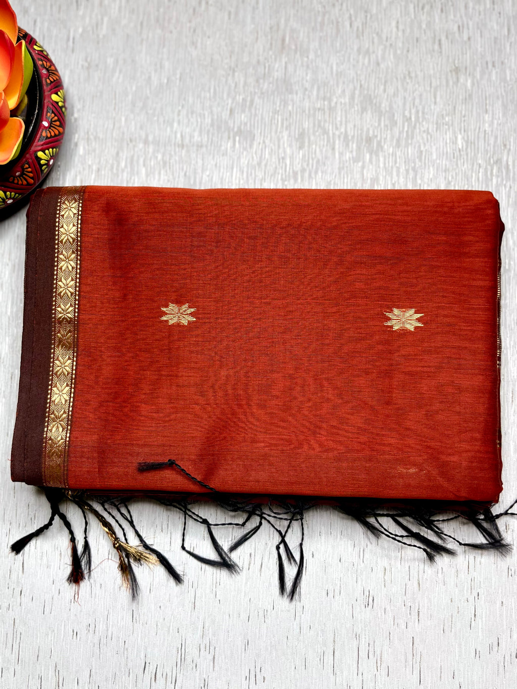 Handwoven Maheshwari Silk Cotton Saree - Mexican Orange + Flush Maroon