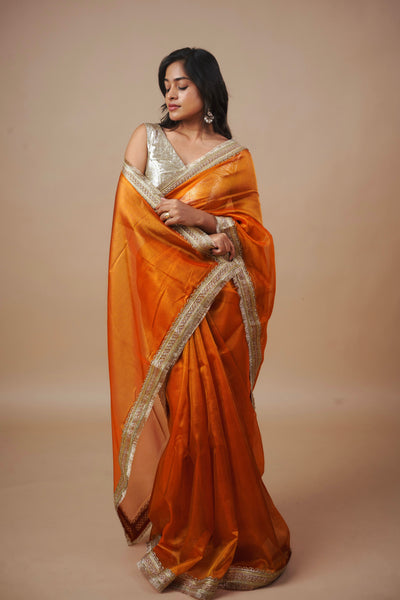 Unveil grandeur with our ‘Alya’ Handwoven Tissue Silk Saree in a captivating Coral Orange shade. Drenched in luxury, this masterpiece is elevated with an opulent lace border that exudes richness and festive charm.