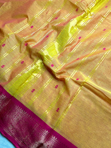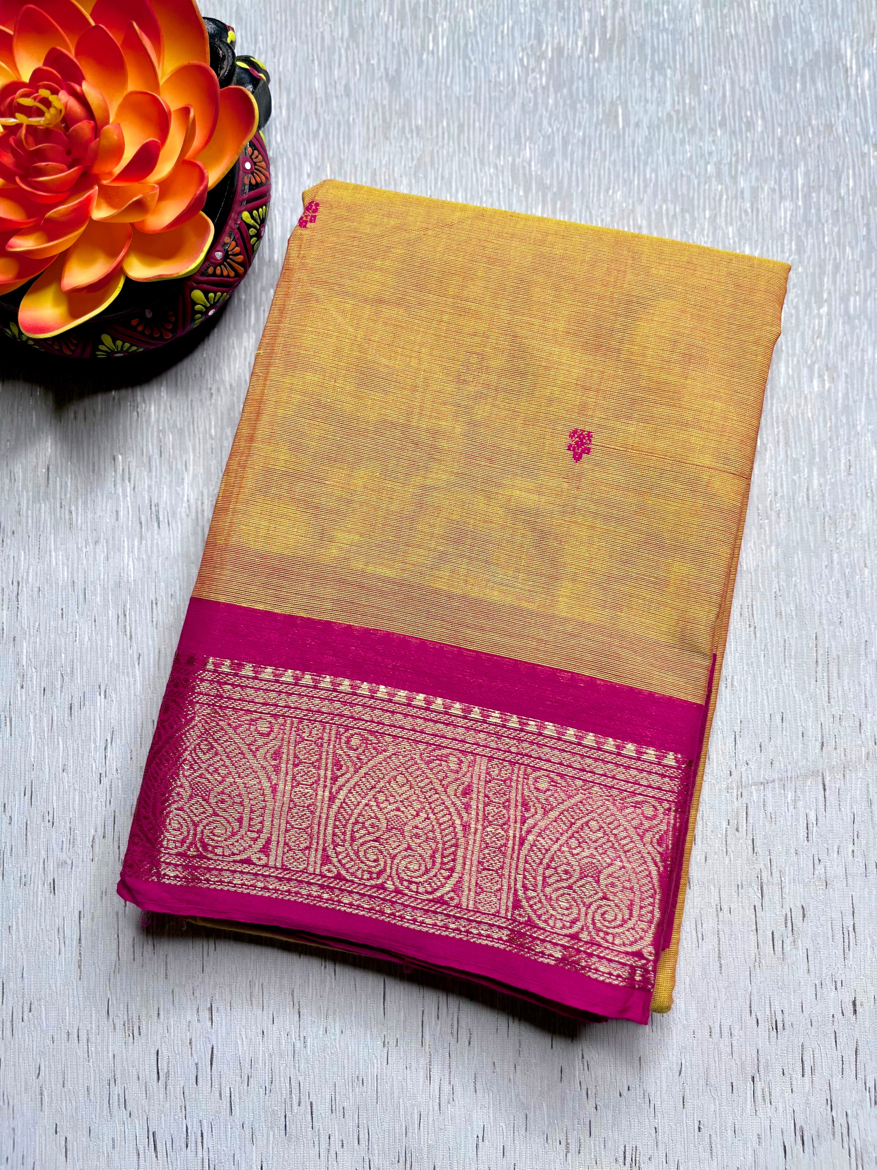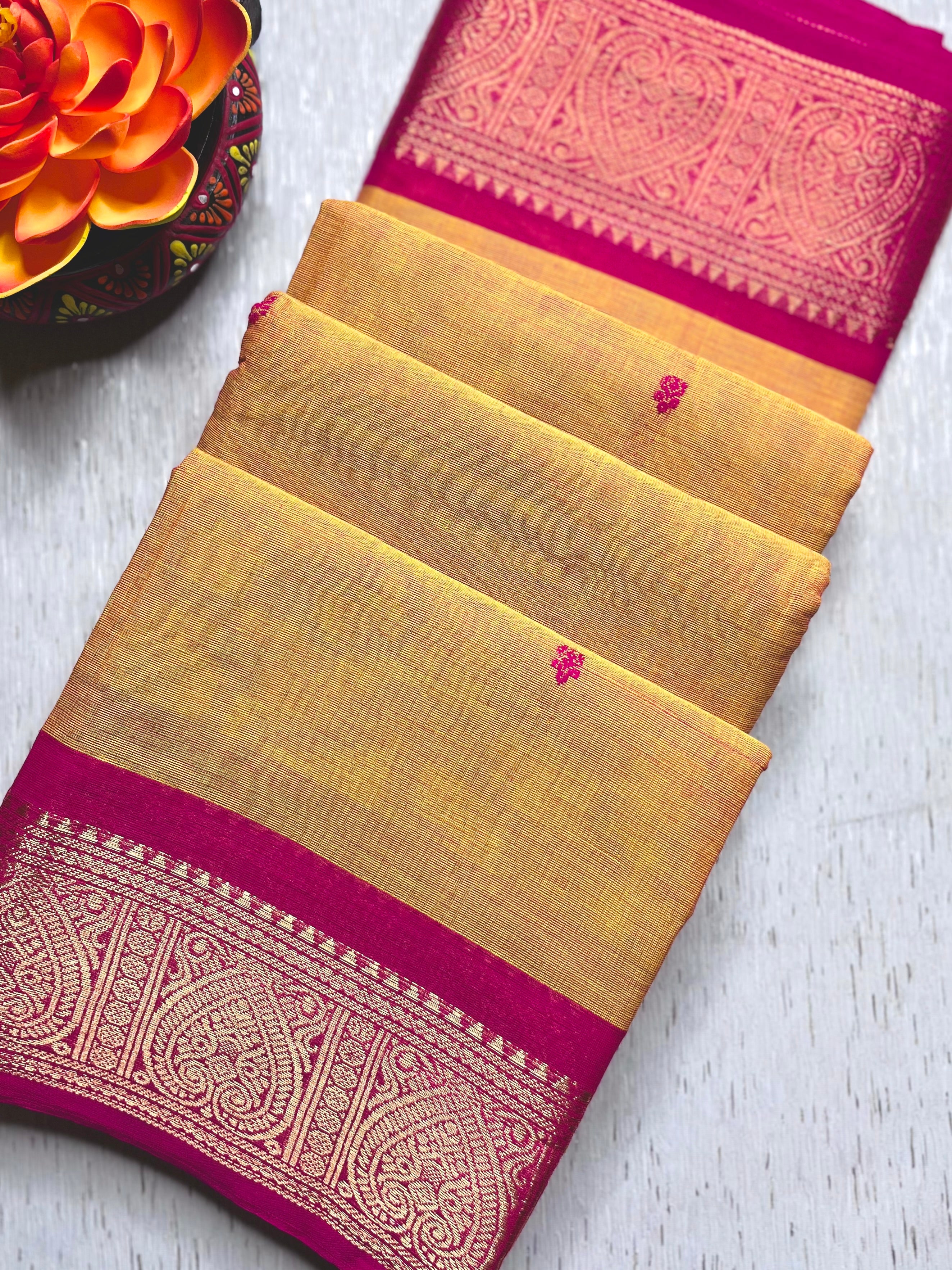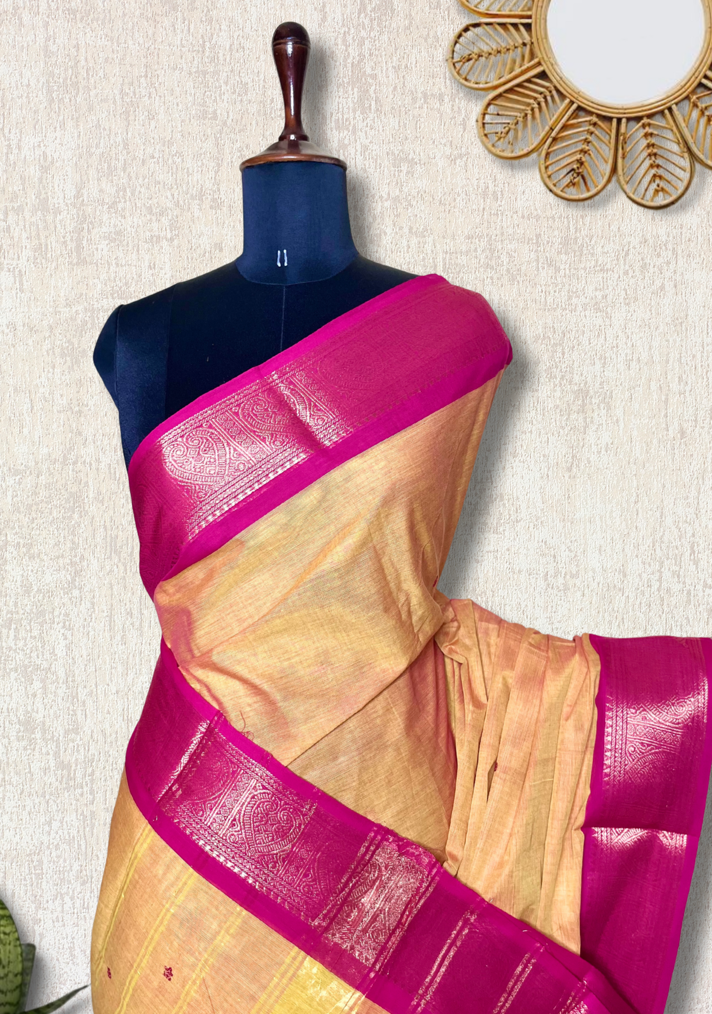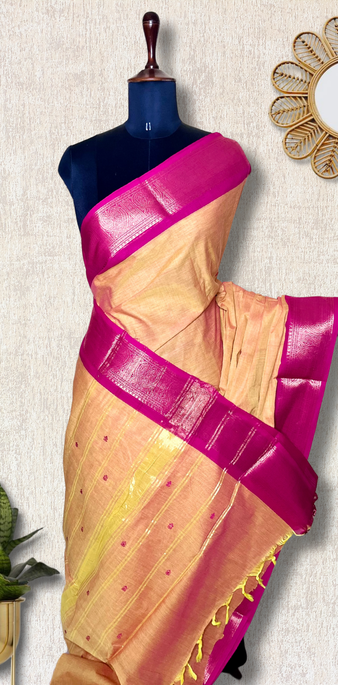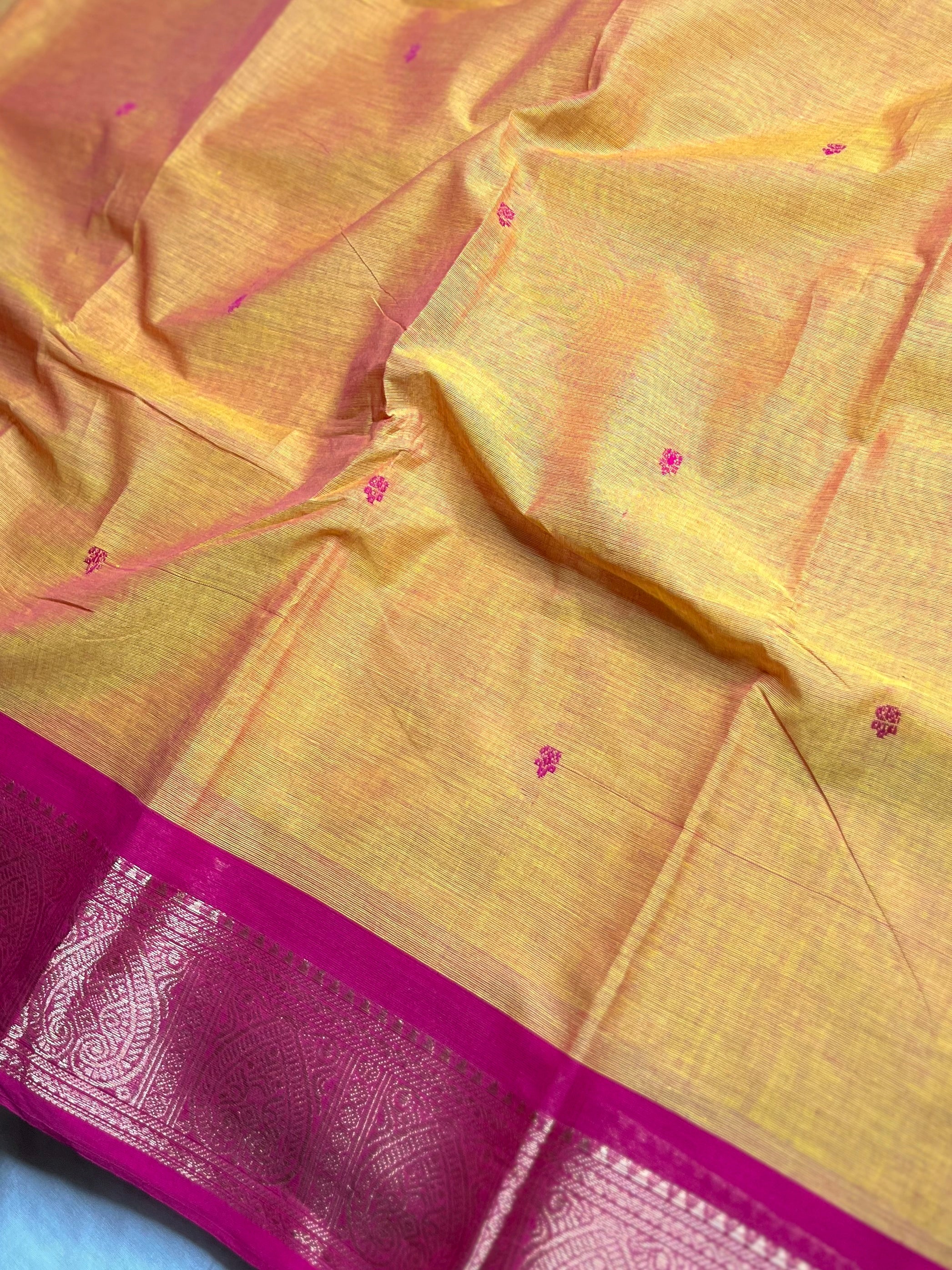 Check out the beautiful shade of pumpkin orange yellow and cerise pink chettinad cotton saree with buttas all over the body and striped pallu. This saree comes with a running blouse.