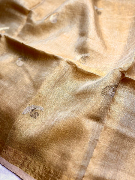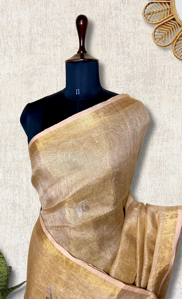 Diva - Sandal Gold Handwoven Metallic Linen Tissue Saree—a lightweight, festive delight! With its subtle sheen and airy feel with all over lotus motifs, it's perfect for special occasions.
