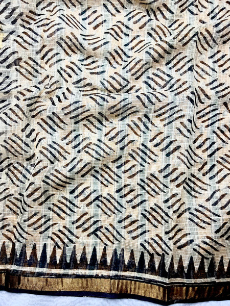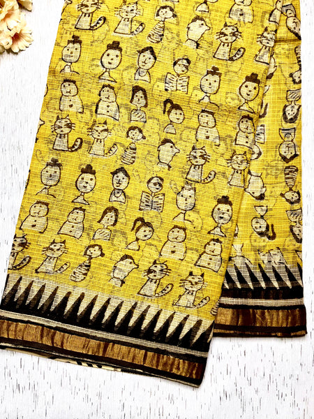 Check out the beautiful shade of mustard yellow and pearl black handcrafted kota doria saree with all over abstract pattern.This saree comes with a printed contrast blouse.