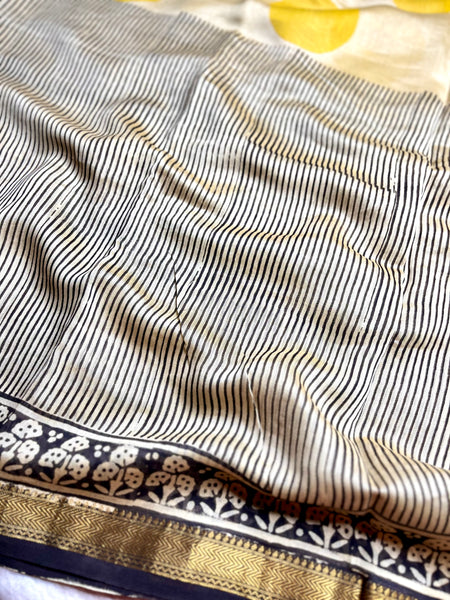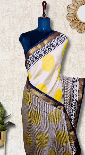 Check out the beautiful shade of vista cream and corn yellow handcrafted silk cotton saree with all over polka dot pattern . This saree comes with a running blouse and gold zari border.