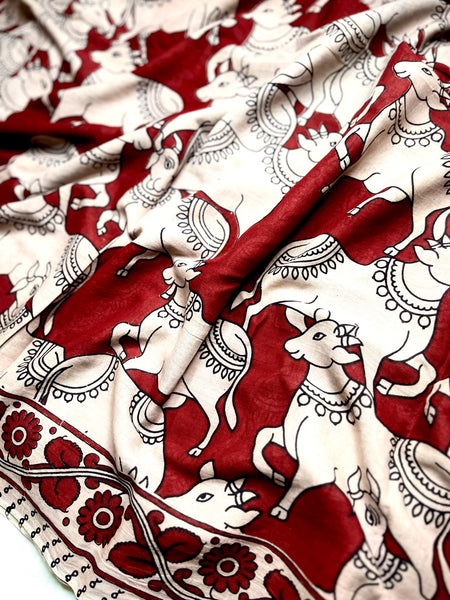 Step into tradition with this persian maroon and soft cream Kalamkari cotton saree, adorned with delicate cow motifs screen-printed all over the body. Crafted from soft, breathable cotton, this saree offers a perfect blend of comfort and heritage—ideal for everyday elegance or casual festive styling.