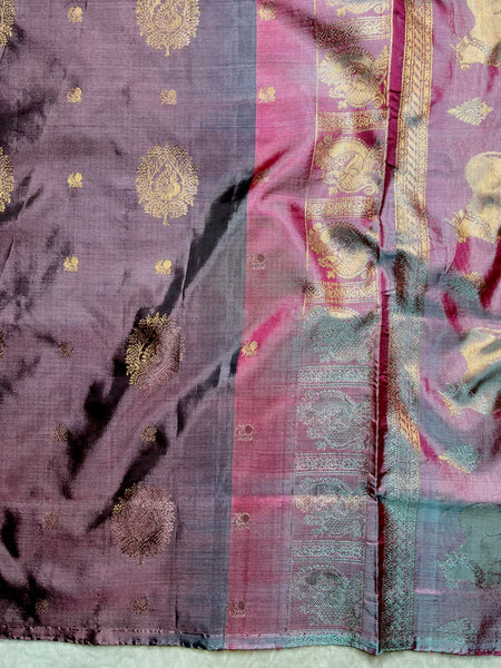 Dive into a world of enchantment with this Chinnalapattu art silk saree, graced by the captivating shades of Congo Brown and Rose Bud Cherry. Its exquisite all-over zari motifs and embellishments contrasting pallu create an everlasting allure.