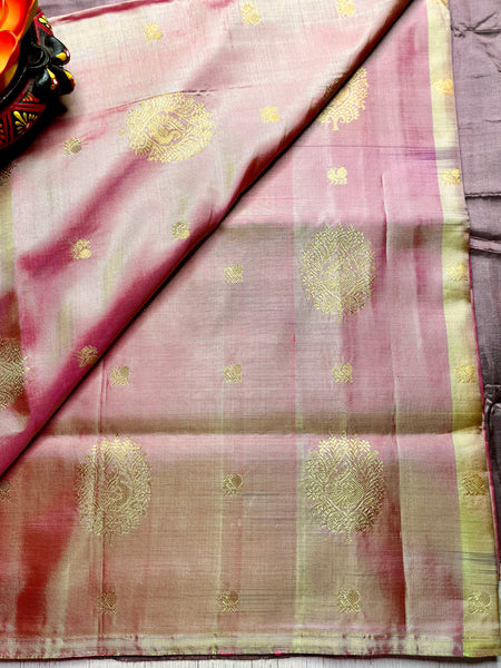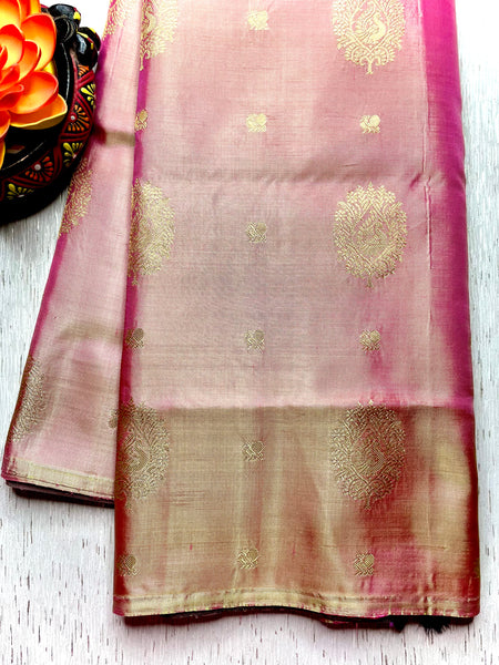 Dive into a world of enchantment with this Chinnalapattu art silk saree, graced by the captivating shades of persian pink and suva gray . Its exquisite all-over zari motifs and contrasting pallu create an everlasting allure.
