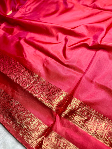 Dive into a world of enchantment with this Chinnalapattu art silk saree, graced by the captivating shades of persian red. Its exquisite zari detail in the border and contrasting pallu create an everlasting allure.