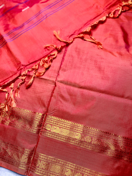 Meticulously crafted by skilled artisans in Tamil Nadu, this saree showcases their unrivaled mastery and unwavering commitment. Its feather-light composition makes it a perfect companion for joyous celebrations, effortlessly embodying your innate grace and impeccable style. Let this saree become a true reflection of your distinctive elegance and irresistible charm.