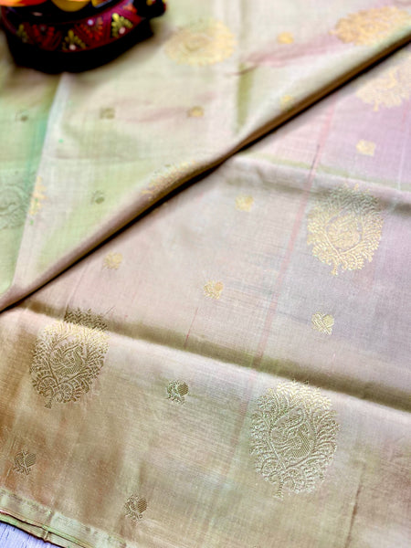 Meticulously crafted by skilled artisans in Tamil Nadu, this saree showcases their unrivaled mastery and unwavering commitment. Its feather-light composition makes it a perfect companion for joyous celebrations, effortlessly embodying your innate grace and impeccable style. Let this saree become a true reflection of your distinctive elegance and irresistible charm.