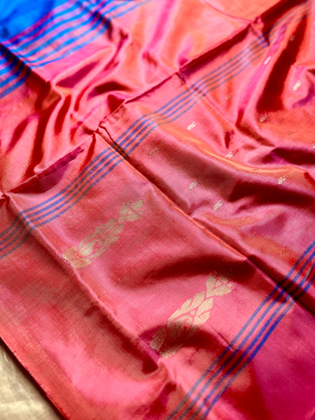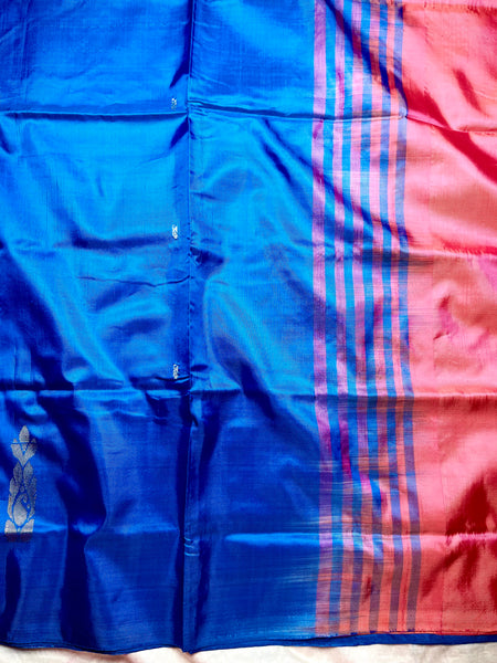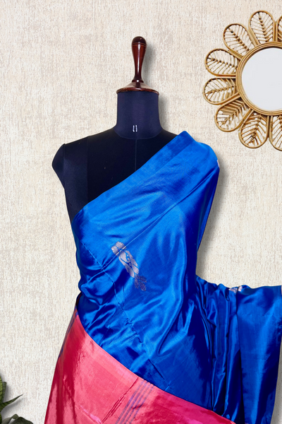 Dive into a world of enchantment with this Chinnalapattu art silk saree, graced by the captivating shades of tory blue and hippie pink. Its exquisite all-over buttas and contrasting pallu create an everlasting allure.
