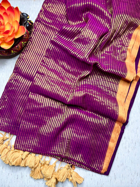 Check this pure handloom light weight cotton saree in a rare combo of electric purple and gold which comes with grand gold zari stripes along the border.
