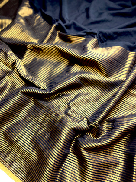 Check this pure handloom light weight cotton saree in a rare combo of charcoal black and gold which comes with grand gold zari stripes along the border.