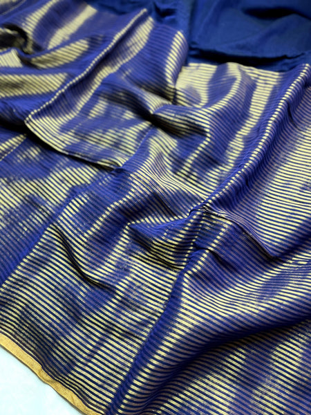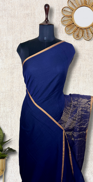 Check this pure handloom light weight cotton saree in a rare combo of persian blue and gold which comes with grand gold zari stripes along the border.