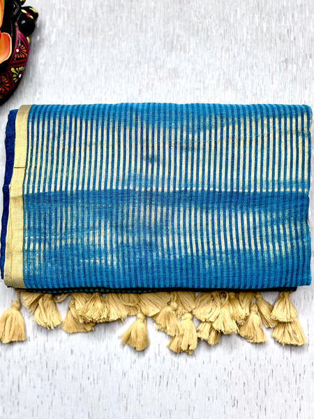 Check this pure handloom light weight cotton saree in a rare combo of teal blue and gold which comes with grand gold zari stripes along the border.