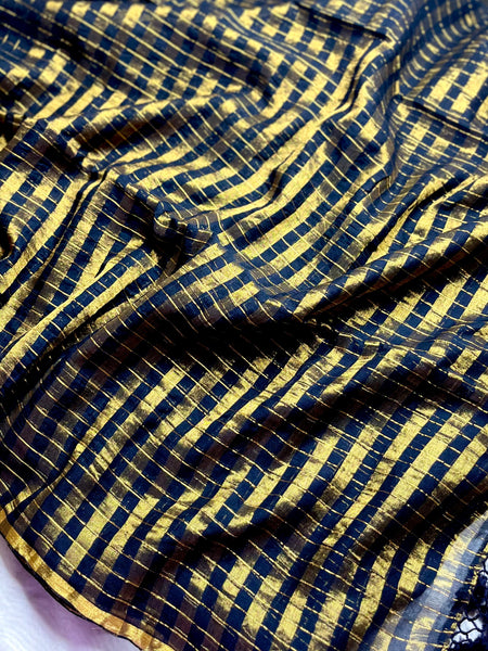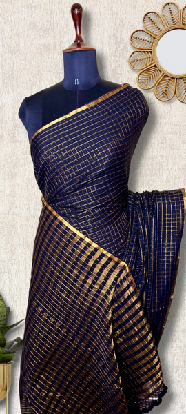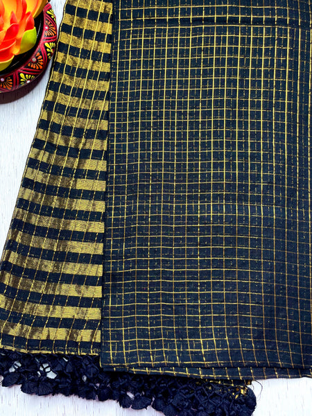 Check this pure handloom light weight cotton saree in a rare combo of russian black and gold with all over mini checks in the body and comes with grand pallu.