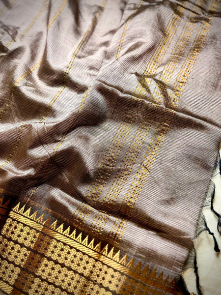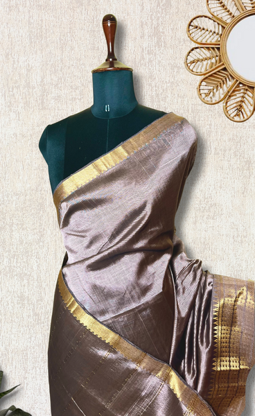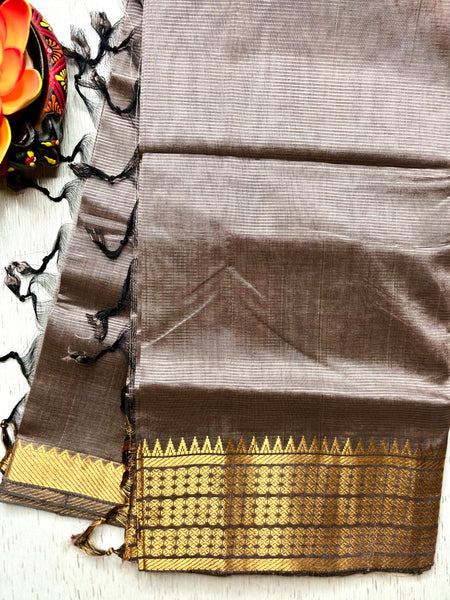 Check this pure handloom, light-weight, twilight color mangalgiri silk cotton saree. It comes with a plain running blouse and gold border on both sides of the saree.