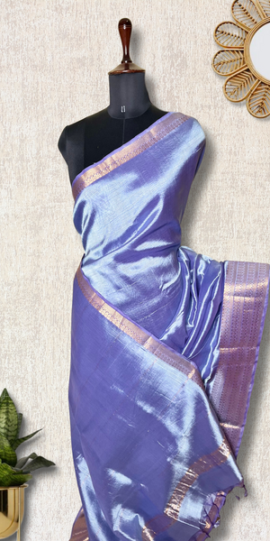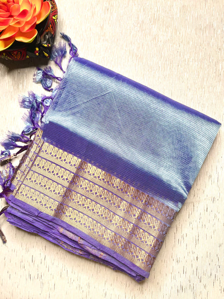 Check this pure handloom, light-weight, cold blue color mangalgiri silk cotton saree. It comes with a plain running blouse and gold border on both sides of the body.