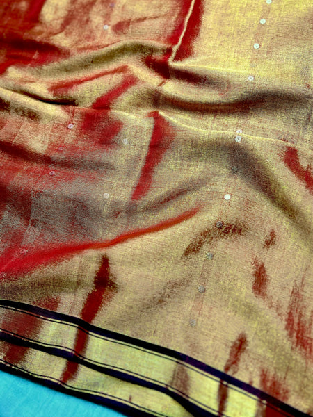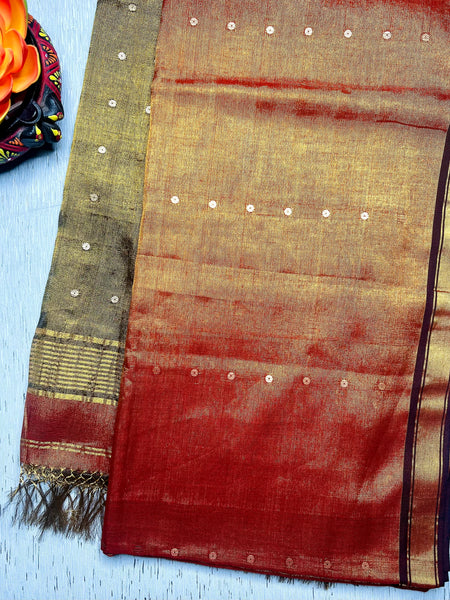 Handwoven tissue saree is loved for its versatility & subtle sheen. Woven by hand, this saree comes with gold zari border and stripes with sequin all over the body.