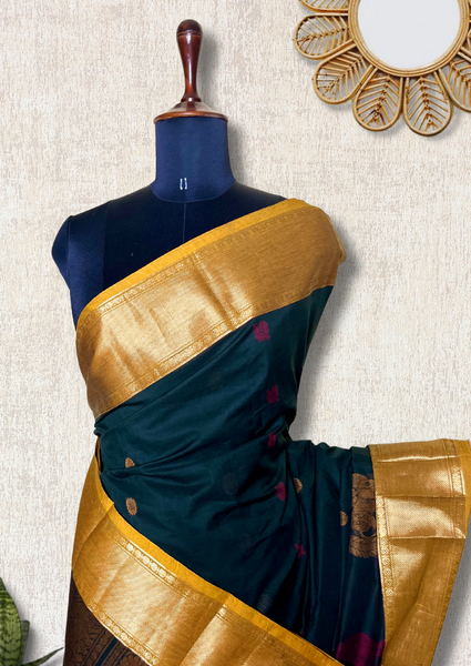 Check out the beautiful shade of deep green and fuel yellow kanchi cotton saree with all over motifs. This saree comes with a running blouse and grand pallu.