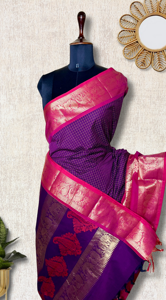 Check out the beautiful shade of trendy purple and brilliant rose kanchi cotton saree with small checks all over the body and contrast gold zari border. This saree comes with a running blouse and grand pallu.