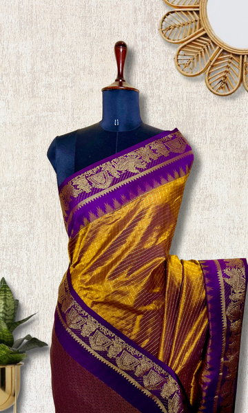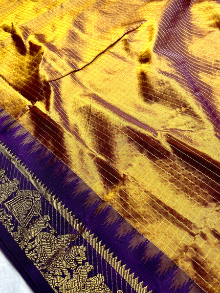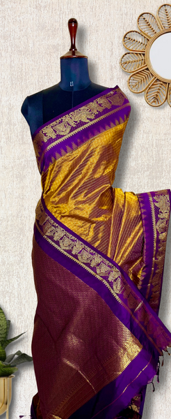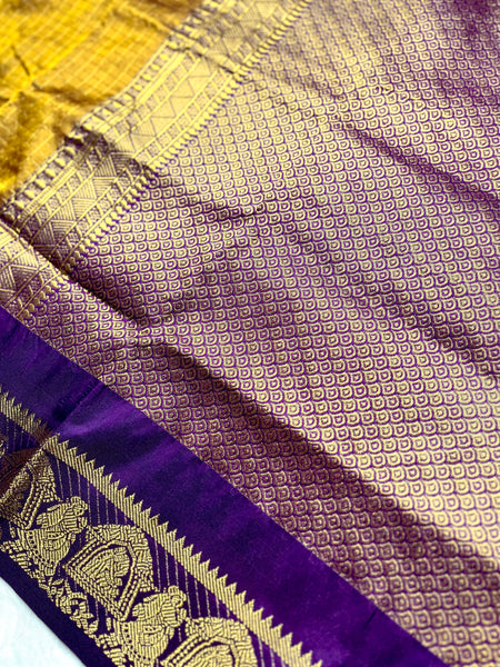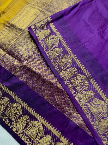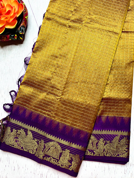 Check out the beautiful shade of marigold and violet eggplant silk cotton saree with heavy zari border. This saree comes with a contrast blouse and grand gold zari pallu. Here the body of the saree comes with all over zari checked pattern.