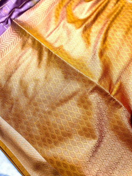Drape yourself in elegance with this exquisite Kanchi Soft Silk Saree in a stunning opera mauve color, featuring delicate checked butta patterns all over the body. The graceful contrast zari pallu adds a touch of grandeur, perfectly paired with a contrasting yellow ochre color blouse. A timeless piece that blends tradition with sophistication, perfect for festive and special occasions.