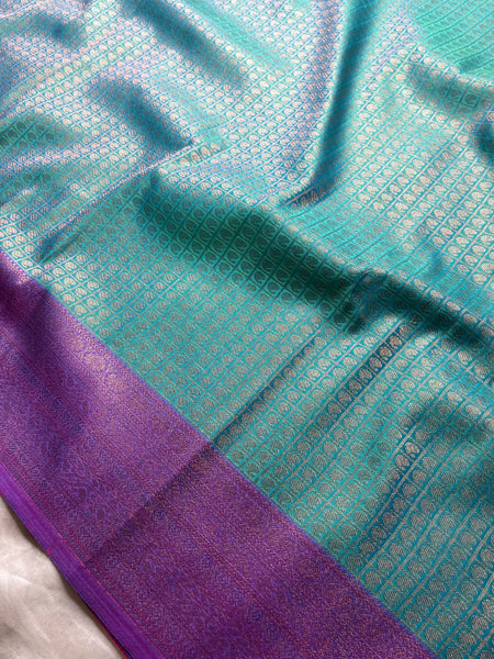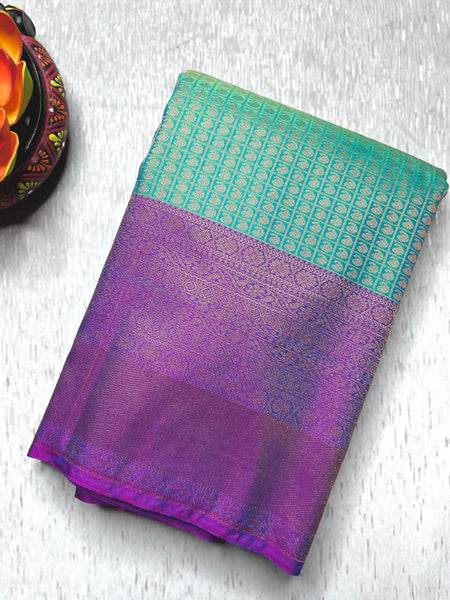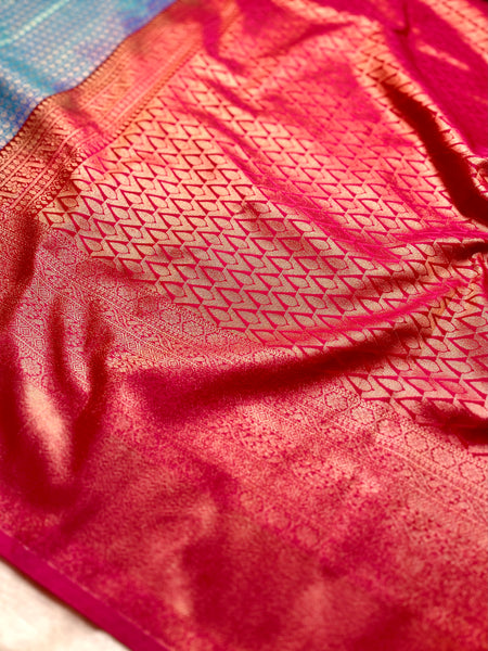 Drape yourself in elegance with this exquisite Kanchi Soft Silk Saree in a stunning steel blue color, featuring delicate paisley patterns all over the body. The graceful contrast zari pallu adds a touch of grandeur, perfectly paired with a contrasting cannon red color blouse. A timeless piece that blends tradition with sophistication, perfect for festive and special occasions.