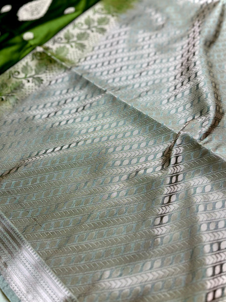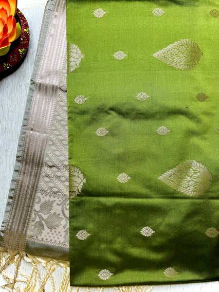 Drape yourself in elegance with this exquisite Kanchi Soft Silk Saree in a stunning sushi green color, featuring delicate butta patterns all over the body. The graceful zari pallu adds a touch of grandeur, perfectly paired with a matching quill gray color blouse. A timeless piece that blends tradition with sophistication, perfect for festive and special occasions.