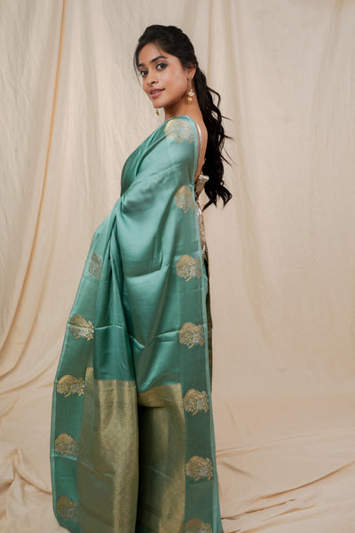 Step into effortless elegance with Yuri, a Banarasi satin silk saree that shines in a stunning glacier blue hue. Light, breezy, and graceful, this drape is designed to flow beautifully, making it perfect for both grand occasions and intimate celebrations.